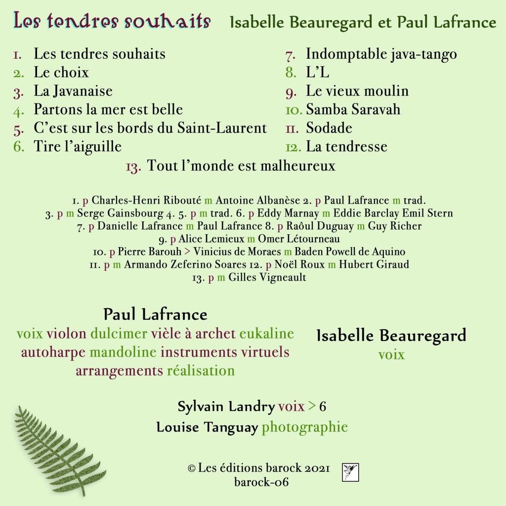 Voilà déjà une décennie, Isabelle Beauregard, grande chanteuse devant l’Éternel, ne manque pas de croiser, deux fois plutôt qu’une d’ailleurs, Paul Lafrance, compositeur, arrangeur, violoneux.iste et réalisateur. Tous deux aiment la musique traditionnelle du monde entier, la chanson française et québécoise, qu’ils regrettent de ne plus entendre assez souvent. Le simple plaisir d’interpréter un répertoire inspirant fait naître leur duo et fleurir le projet d’un album. Ensemble ils traceront leur (micro)sillon. «Il n’est jamais trop tard pour bien faire», comme disait Robert Larousse. Suivez-les dans leurs entourloupettes enturlutées, de Paris à l’Acadie, de Gréco à Raôul, de la belle à  La bonne chanson, grâce à l’album Les tendres souhaits.